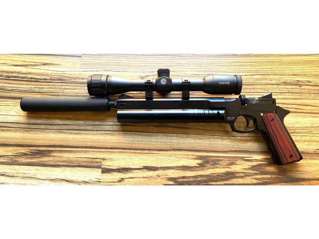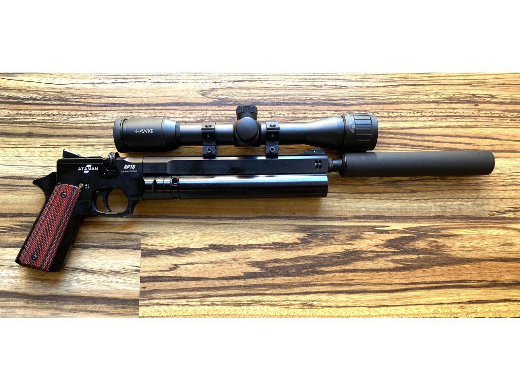 Exkluzívne na predaj PCP vzduchová pištoľ Ataman AP16 Standart 5,5mm s regulátorom a zásobníkom na 7 rán. Voľne plávajúca hlaveň Lothar Walther s dĺžkou 228mm. Montážna lišta 11mm pre montáž kolimátoru, prípadne pištoľového puškohľadu. Otvorené mieridlá, plne nastaviteľná spúšť v rozmedzí 0,2-1kg. Pažbičky sú z orechového dreva. Kartuša s manometrom v prednej časti má objem 108cm3 a plní sa pomocou Quickfilleru tlakom až do 300BAR. Manuálna poistka, celková dĺžka 365mm, hmotnosť zbrane 1kg.